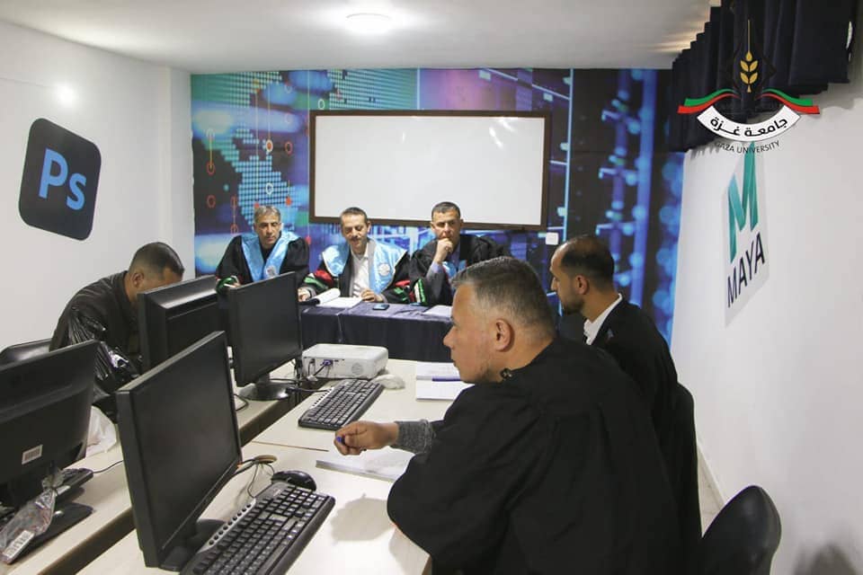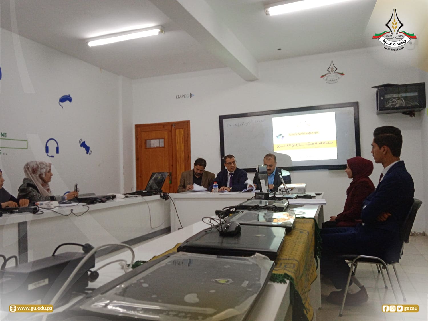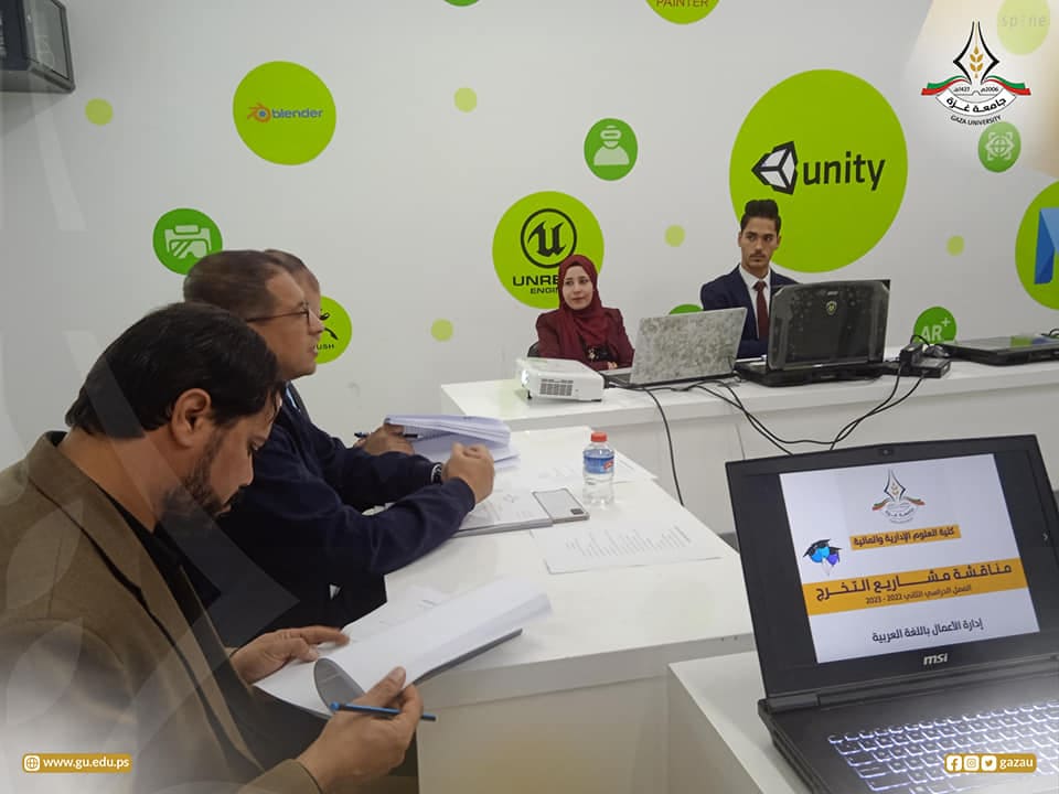 The graduation projects of business administration and accounting students registered for the course were discussed in the second semester of the academic year 2022-2023. The discussion committees in the main branch in Gaza consisted of Dr. Tariq Abu Hjayyer and Dr. Firas Shehadeh, supervisors of graduation projects, Dr. Hassan Abu Nasser, Dr. Nael Musabeh. And Dr. Salem Al-Amour. In the North Branch, the committee consisted of Dr. Muhammad Al-Za’noun, project supervisor, Dr. Ali Abu Jarad, and Dr. Nabil Al-Louh. The committees praised the level of students’ projects and their clear efforts in completing the projects.