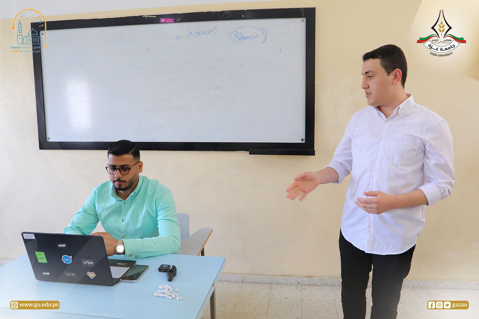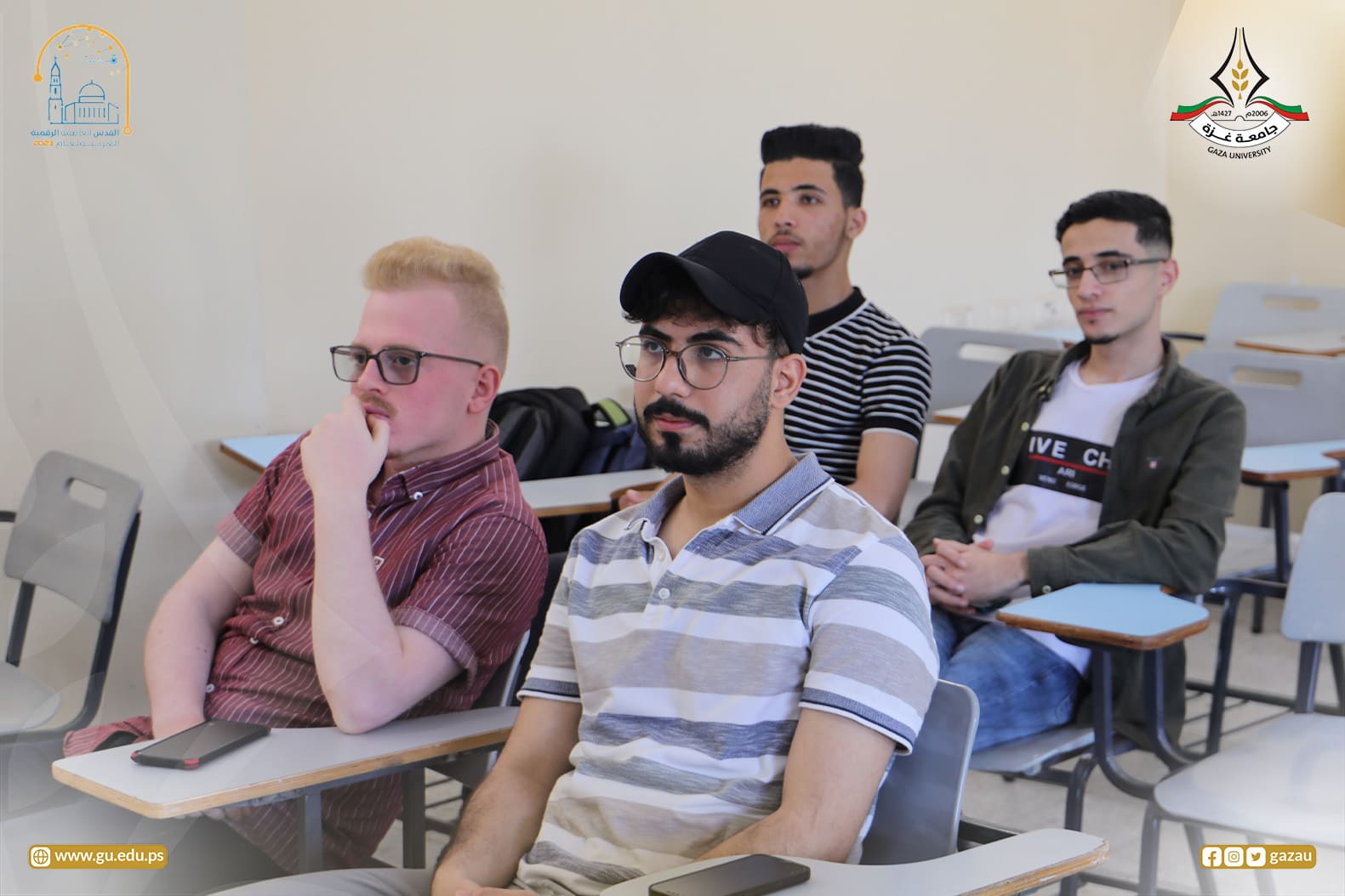 The Department of English Language and Translation at the Faculty of Communication and Languages in Gaza University organized a workshop for its students on simultaneous translation. The workshop was held as part of the Simultaneous Translation course under the supervision of Mr. Imad Hamdona, the course lecturer. The aim of the workshop was to highlight the students' skills in simultaneous translation and enhance their abilities to engage in the job market. Two students, Hashem Hamdan and Omar Mahna, practically demonstrated the activity. Hashem Hamdan played the role of an ambassador from the European Union, while Omar Mahna acted as his simultaneous interpreter. The attendees, consisting of students from the department, engaged in dialogue and discussions on the topic.
