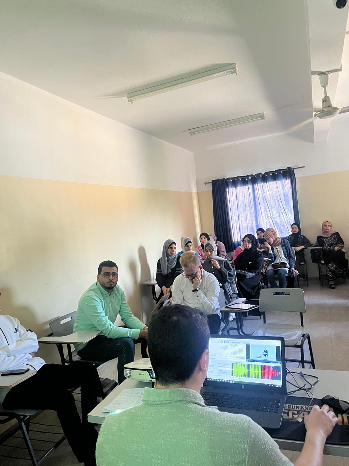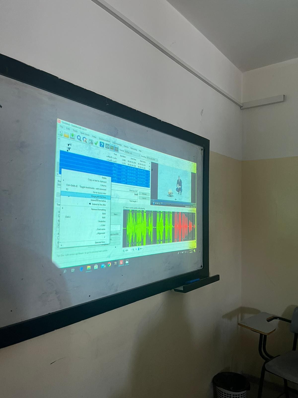 وبدأ الطالب عمر مهنا منسق الورشة وأحد طلبة القسم بالحديث حول ترجمة الشاشة SUBTITLING، والفرق بينه وبين كما وتحدث عن البرامج التي يتم استخدامها في ترجمة الشاشة، وكيف تقوم بالتفريغ الصوتي مستخدماً برامج ترجمة الشاشة.